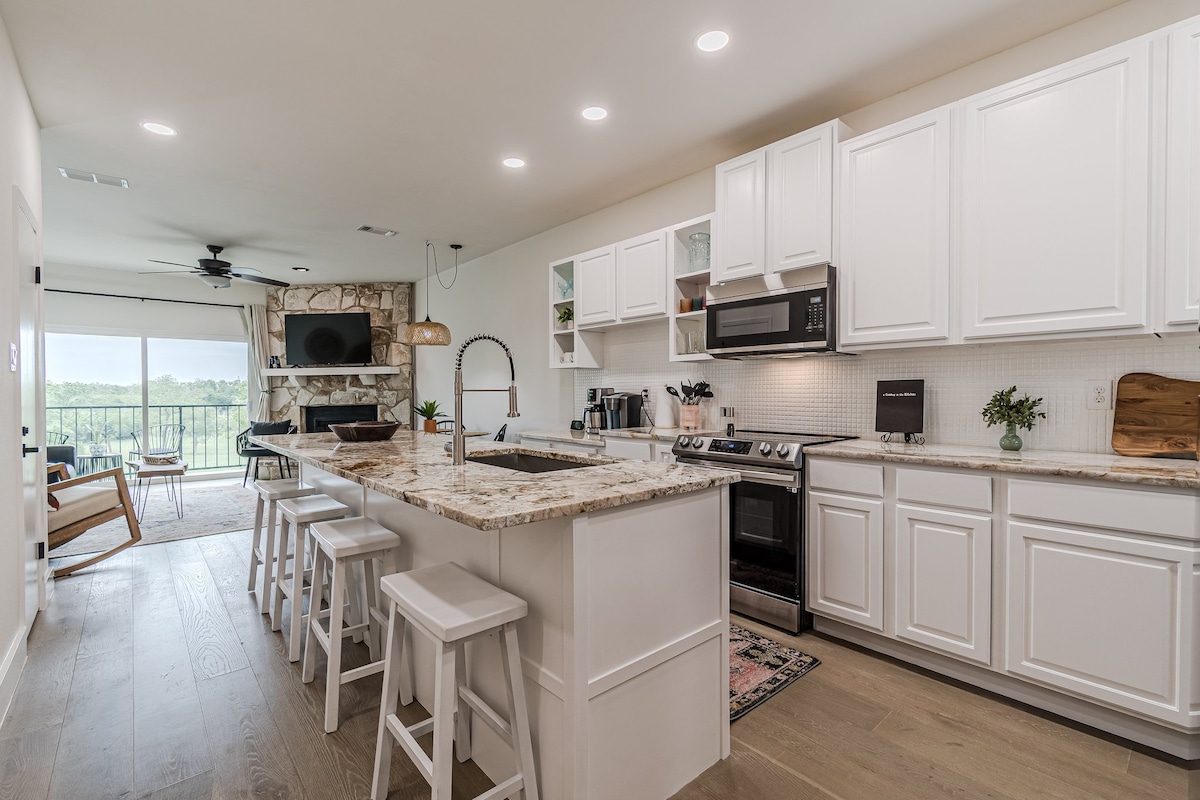 Aktualisiert 2 Betten/2 Badezimmer am Guadalupe River. Nur wenige Minuten von der Innenstadt von New Braunfels und der Schlitterbahn entfernt, bietet diese Wohnung fantastische Updates und einen schönen Blick auf die Tier- und Picknickplätze. Granit-Arbeitsplatten, tiefe Waschbecken und neu renovierte Badezimmer. Intelligentes Thermostat und Türschloss. Fahren Sie den Guadalupe River hinunter und steigen Sie an der Waterwheel-Stelle aus (keine Fahrt erforderlich!). Die Anlage verfügt über Aufzüge, 2 Pools, 4 Whirlpools, Picknickplätze mit Tischen und Grills.