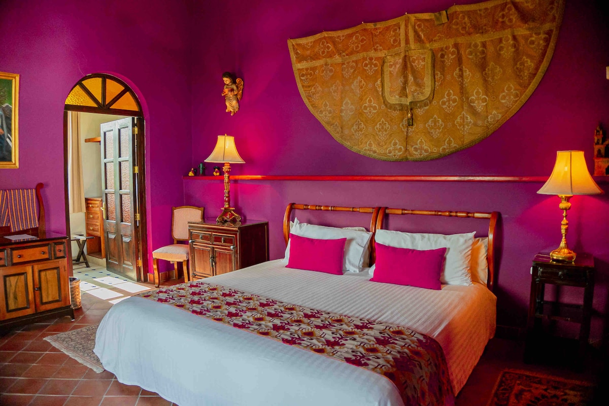 Das Zimmer „Rosa“ bietet eine romantische und charmante Atmosphäre mit einem Kingsize-Bett und einem eigenen Bad. Die Wände im rosa Farbton und die rustikal-mexikanischen Möbel erzeugen eine warme und einladende Atmosphäre, perfekt für Paare oder Reisende, die einen intimen Raum suchen.