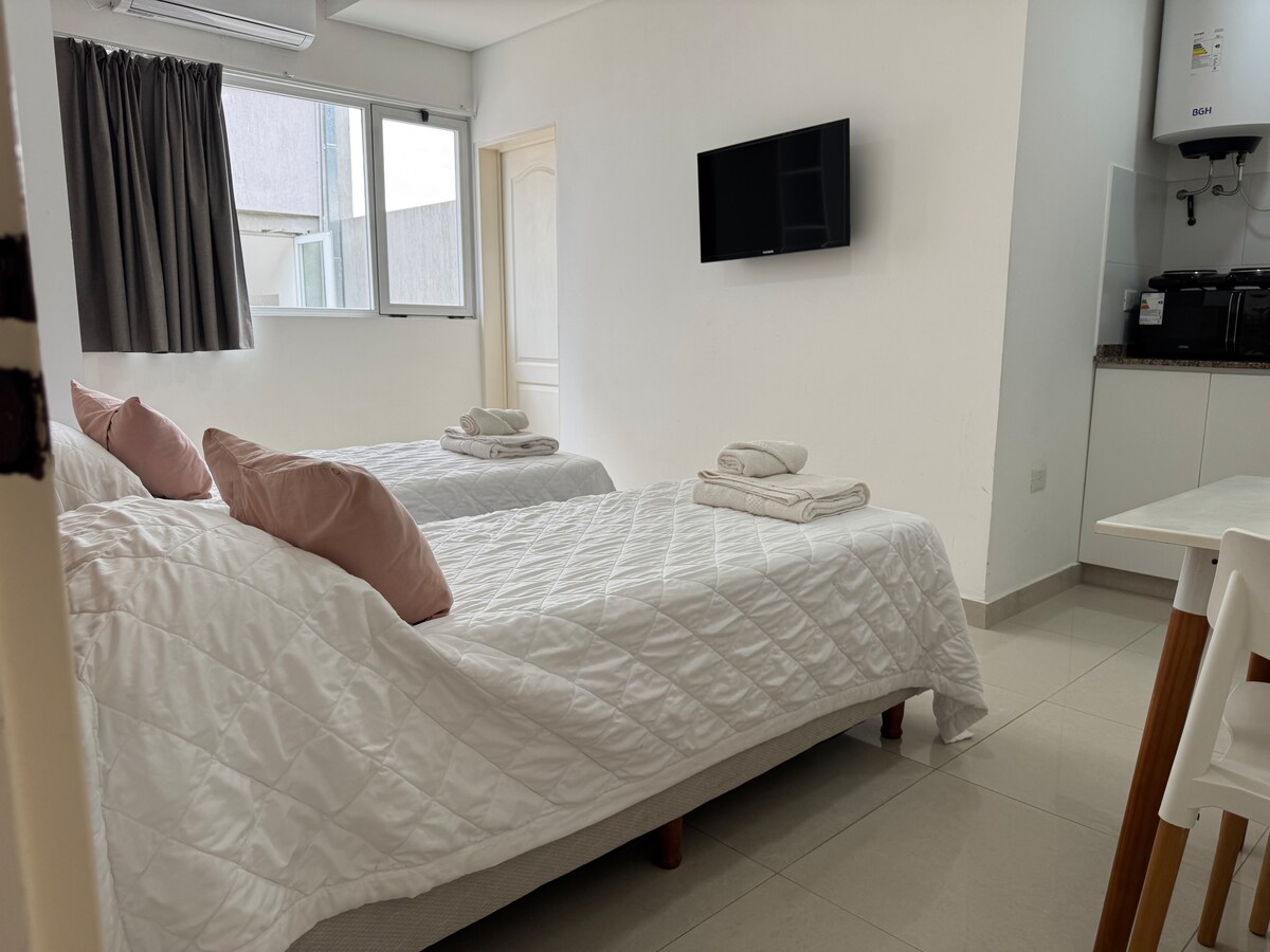 Dieses Apartment mit einem Zimmer ist ideal, um die Ruhe der Anlage zu genießen. Es liegt in der besten Gegend von Pilar, nur wenige Meter von den Einkaufsmöglichkeiten Palmas del Pilar y Torres del Sol entfernt, vor der Panamericana. Sie bietet Platz für 2 Personen und verfügt über eine Küche, ein komfortables Badezimmer und moderne Möbel. Die Anlage verfügt über einen Pool, einen Wäscheservice und befindet sich in der Nähe der öffentlichen Verkehrsmittel. HAT KEINE EIGENE GARAGE Es gibt kostenlose Parkplätze vor der Anlage, aber sie stehen zur Verfügung und sind nicht privat.