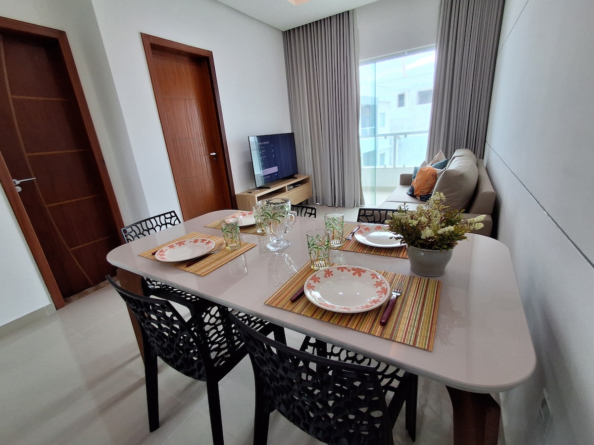 Apartamento novo todo mobiliado. Duas suítes com ar condicionado, TV, guarda roupas. Cada suíte podendo comportar até 4 pessoas. Roupas de cama e banho. Sala de estar com ar condicionado. TV 65" led na sala e 32' nos quartos. Lavabo. Cozinha totalmente equipada. Acesso a piscina. Portaria 24 horas para sua segurança. Área de serviço com tanque e varal. Entregamos o apartamento limpo e higienizado. Um espaço confortável cheio elegância e muita tranquilidade.