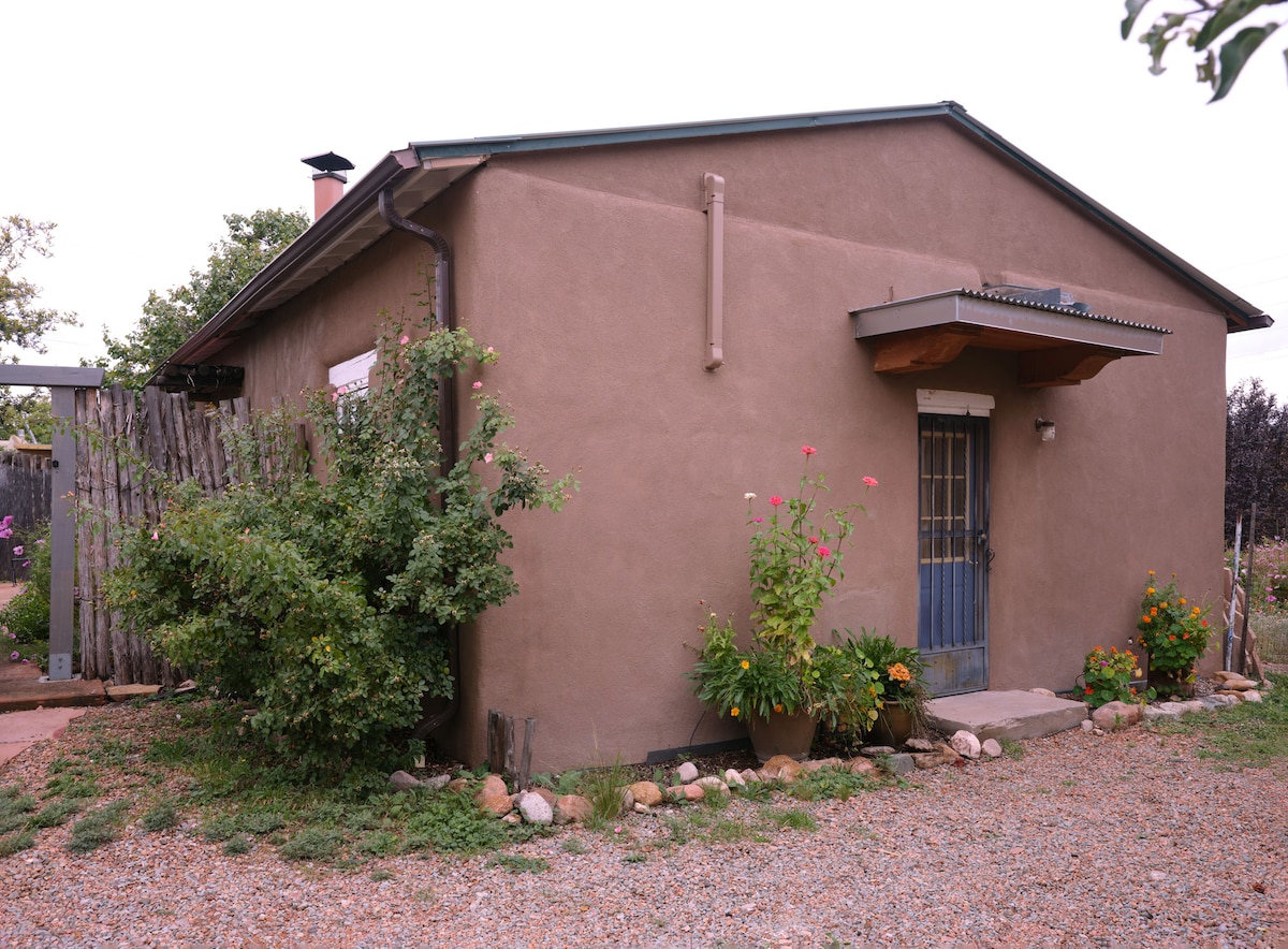 Willkommen in Santa Fe! Dieses charmante Studio-Ferienhaus und mein Zuhause teilen sich das Grundstück in dieser ruhigen Wohngegend. Das Ferienhaus ist voller Santa-Fe-Charme mit einem gemütlichen, hübschen Interieur, Oberlichtern und viel natürlichem Licht, einer voll ausgestatteten Küchenecke, handgefertigten Schränken, mexikanischen Fliesen, einem bequemen Queensize-Bett und einer privaten Gartenterrasse. Es ist ein ruhiger Hafen, aber zentral gelegen, nur 2 Meilen von der Plaza/Innenstadt entfernt. Es ist ein schöner Ort für Paare, Solo-Abenteurer und Geschäftsreisende.