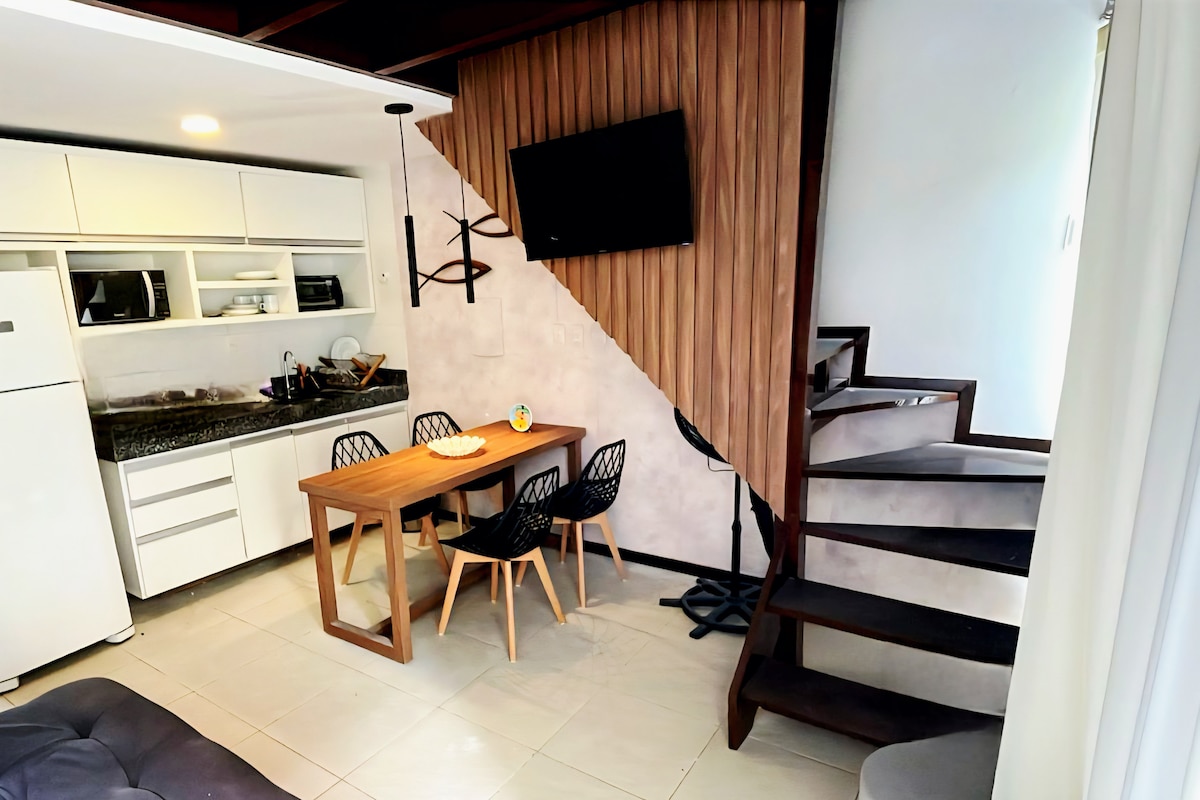 Loft mit unabhängigem Wohnzimmer, Küche, Badezimmer + Klimaanlage, Kühlschrank, Queensize-Bett, Gourmetküche im Freien, Arbeitsplatte, Kochfeld, Heißluftfritteuse, Mikrowelle... Wohnzimmer mit 1 Sofa, Leinen-Sessel, Notebook-Tisch... Wir bieten kostenlosen Wäscheservice. Wir bieten große Handtücher, Bettwäsche, Bettdecken, Ersatzdecken, Seifen, Shampoo, Reinigung und Wartung für den Komfort unserer Gäste