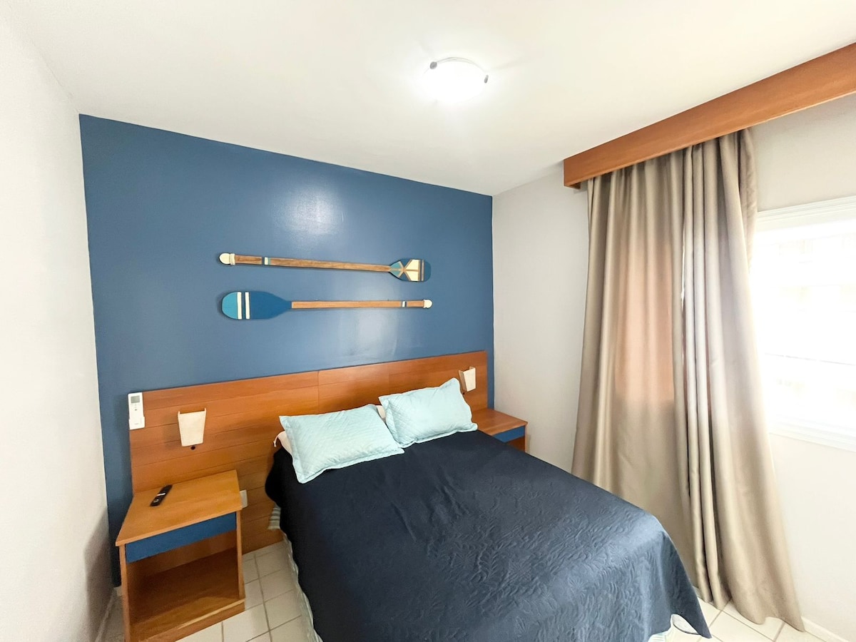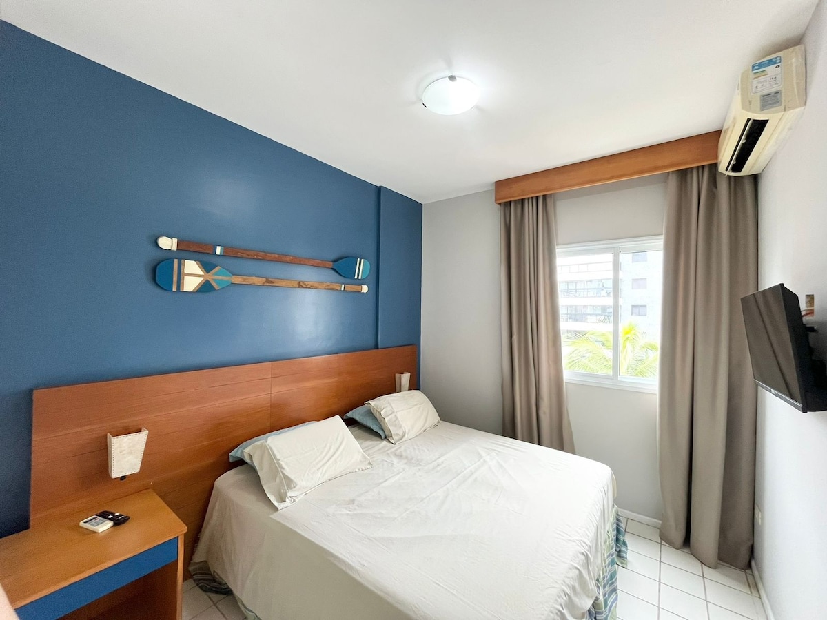 Flat para 4 pessoas, com serviço de limpeza e de praia, restaurante, piscinas e lazer. Fácil acesso à praia (150 m). Totalmente reformado, no 9º andar. Cozinha completa, TV, Wi-Fi e ar condicionado (sala, quarto). Manobrista, serviço de praia (1 guarda-sol e 3 cadeiras, 1 no ape) limpeza diária. Hóspedes devem levar: - toalhas de banho - roupas de cama (lençol grande, King p/casal e lençóis de solteiro para as 2 partes da bicama. Check-in às 15h e check-out às 12h.