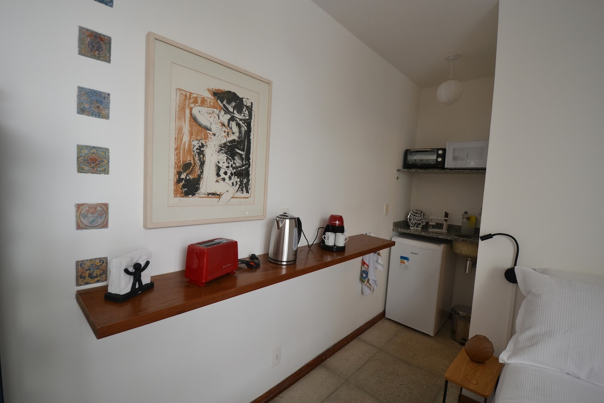 Das ca. 34 Quadratmeter große Studio ist Teil unseres Hauses. Sie verfügt über einen eigenen Eingang. Die ruhige und gemütliche Unterkunft bietet 3 Bereiche in einem einzigen Raum: Queensize-Bett, Sofa mit Fernseher (mit Netflix und Kabelfernsehen), kleine Küche mit mittelgroßem Kühlschrank, kleinem 2-Flammen-Induktions-Elektroherd, Mikrowelle, Elektrobackofen, elektrischem Sandwichmaker und Nespresso-Kaffeemaschine. Hervorragender Blick auf das von Bäumen gesäumte Viertel mit Zugang zum Garten. Nur 400 Meter von der U-Bahn-Station Vila Madalena entfernt.