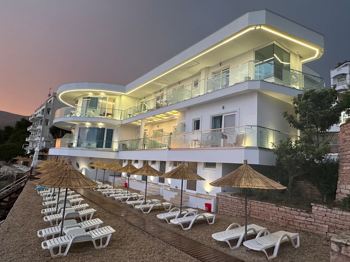 Geräumiges Zimmer in dieser Villa mit herrlichem Balkonblick,ideal zum Entspannen und Genießen deines Urlaubs .Das Zimmer verfügt über ein voll funktionsfähiges Badezimmer , WLAN , Klimaanlage und du hast rund um die Uhr Warmwasser. Es befindet sich an der Seite der zentralen Straße von Saranda, 15 Gehminuten vom Strand und 15 Gehminuten von der atemberaubenden Promenade entfernt. Das Zimmer hat nachts einen herrlichen Blick vom Balkon. Es ist die Lösung, wenn du dich entspannen oder das Frühstück im Garten genießen musst.