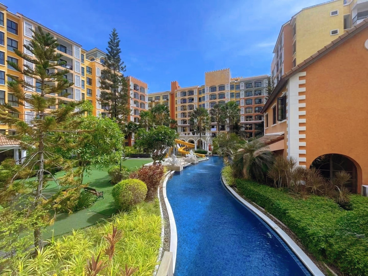 Jomtien Beach ~ Unterkunft mit Wasserpark und Meerblick, 300 m vom Strand entfernt