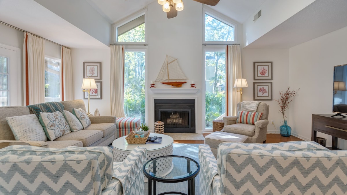 20 Columbine Lane - Dieses geräumige Haus mit 4 Schlafzimmern und 3 Badezimmern im malerischen Sea Pines Resort bietet 2800 Quadratfuß Wohnfläche mit gewölbten Decken und Zugang zu Gemeinschaftseinrichtungen wie einem Pool und Tennisplätzen. Die Unterkunft verfügt auch über starkes WLAN und einen speziellen Arbeitsplatz, was sie zu einer idealen Wahl für Fernarbeit oder Studium macht. Genieße die ruhige Umgebung und die komfortablen Unterkünfte dieses schönen Ferienhauses.