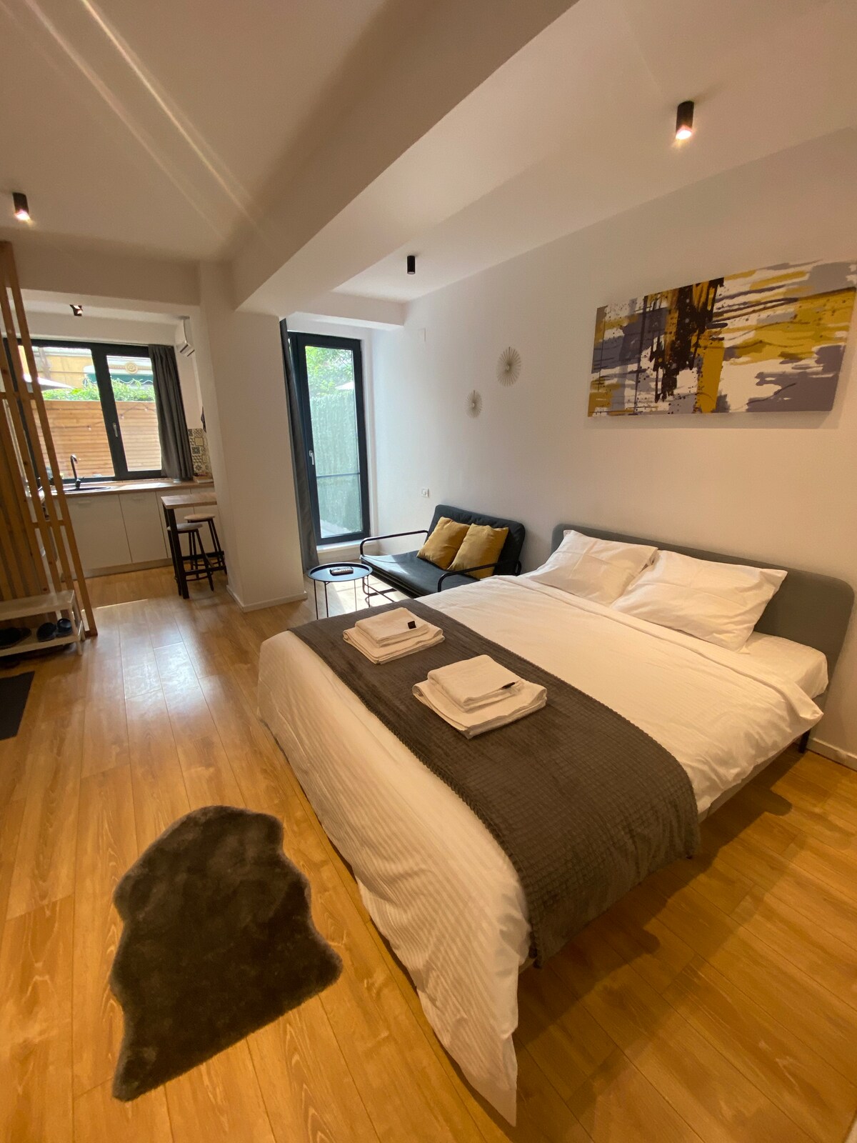 This beautiful and bright studio is located in the heart of Bucharest, right at the vivid Amzei square, a short walking distance from the Old Town. Location wise it doesn't get any better than this. From the large Terrace you have a beautiful city view. The place is easily accessible by public transport (bus & metro). This stylish flat was fully refurbished in the summer of 2023 with high standard materials and has all possible amenities available for a perfect stay.
