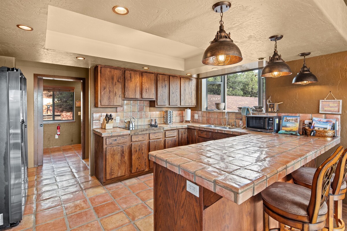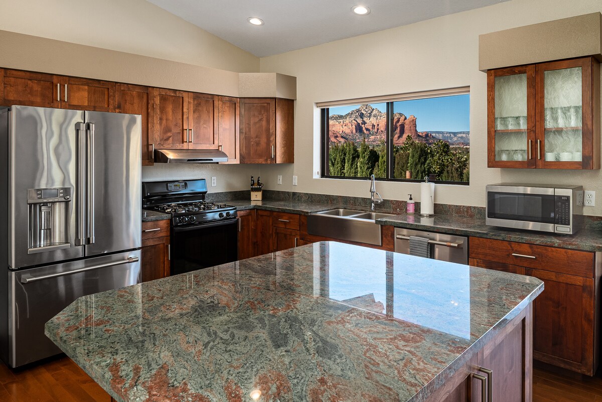 Ausgezeichnet als eine der „12 besten Unterkünfte in Sedona“ 100 % UMGEBAUT. HOCHWERTIG, RUHIG, AUSSICHT, ZUGANG ZUM WANDERWEG & PRIVATES LABYRINTH! Tages-Spa-Gefühl. Privates, ruhiges Zuhause im berühmten Wirbelbereich der Kapelle des Heiligen Kreuzes. Entspanne dich auf dem Sofa mit Blick auf die roten Felsen oder mache einen 2-minütigen Spaziergang zum Broken Arrow Trail System! Holzböden, hochwertige Geräte, Duschen mit Null-Einstieg mit handverlegten, Spa-ähnlichen Kieselböden, Wasserfall-Quarz-Arbeitsplatte, hinterleuchtete Spiegel, Onyx-Waschbecken, sofort heißes Wasser, Luxusbetten, Terrasse, Büro.