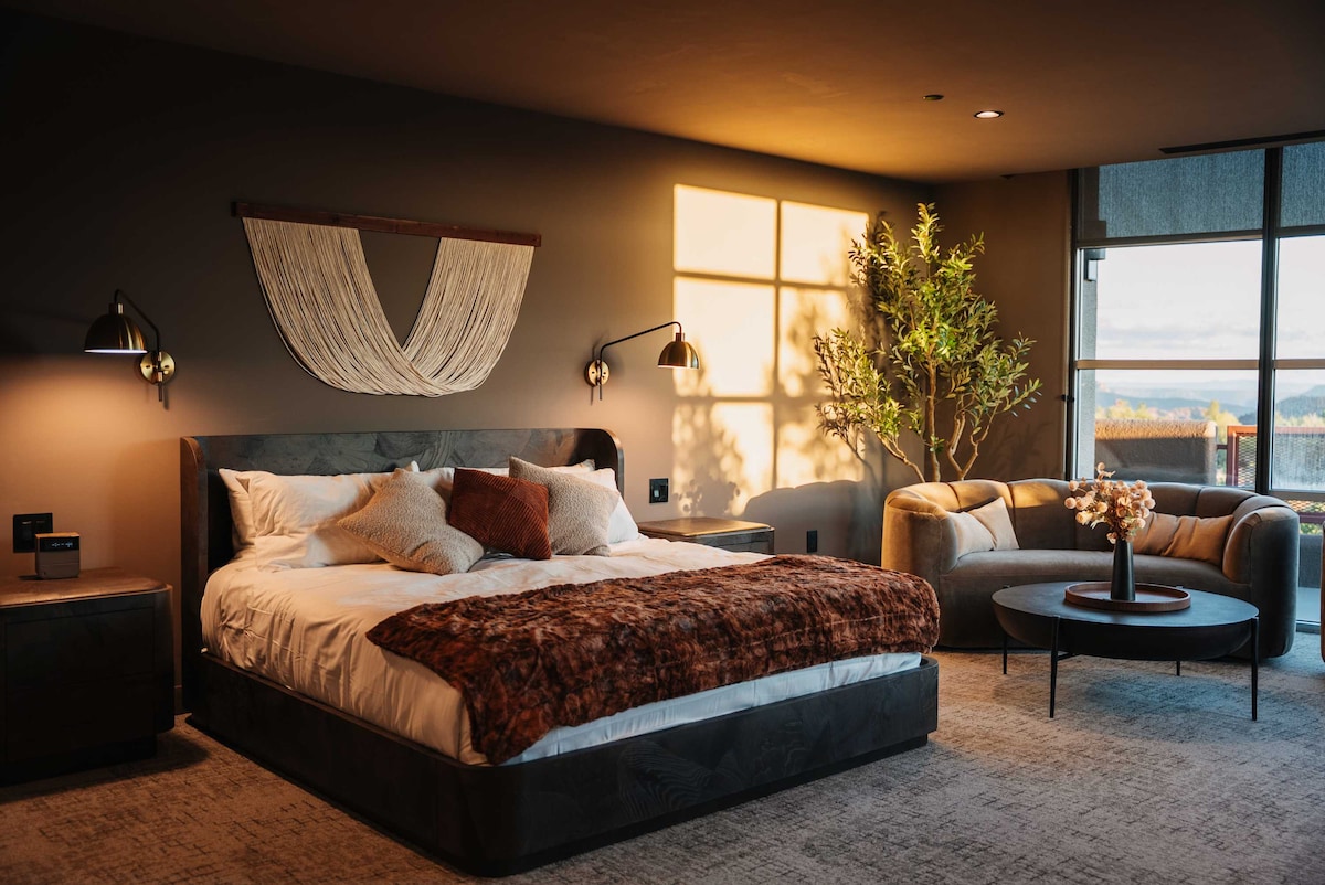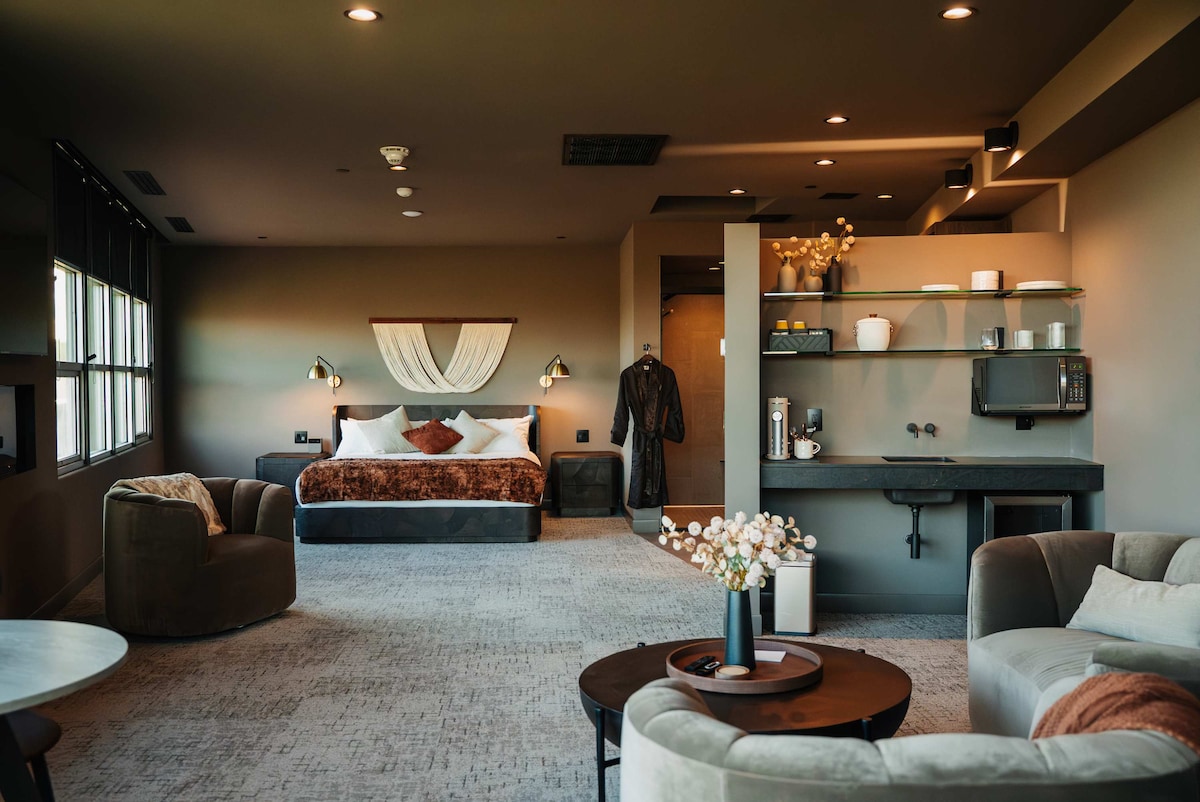 Immerse yourself in the grandeur of Sedona’s canyons with the celestial-inspired Aries Studio. With sweeping southern views with Cathedral Rock in the distance, this studio loft features a plush king bed draped in silky linens, inviting rest and relaxation. The spa-like bathroom features a spacious rainfall shower with artisanal bath salts, perfect for unwinding after a day on the trails. This beautifully appointed loft blends cosmic serenity with desert elegance.
