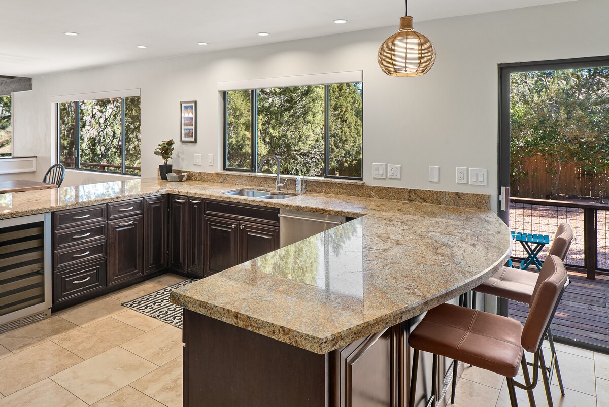Hab Spaß mit der ganzen Familie in dieser neu renovierten Unterkunft im Mid-Century-Modern-Stil in Sedona. Inspiriert vom amerikanischen Architekten Frank Lloyd Wright. Diese Unterkunft liegt weniger als 2 Meilen von Tlaquepaque und Uptown entfernt! Nur wenige Gehminuten von der kostenlosen, umweltfreundlichen Sedona-Shuttle-Station entfernt, die dich zu vielen Wanderzielen bringt. Unglaubliche Aussicht von diesem High-End-Haus. Genieße zu jeder Jahreszeit Spiele im Freien, ein Bad im Whirlpool, eine Nacht am Feuer oder Spiele wie Boccia und Cornhole!