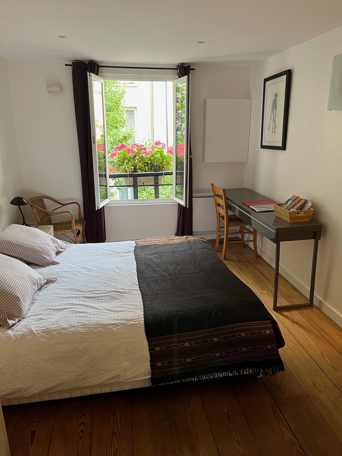 Malerisches Zimmer mit Blick auf einen Garten mit eigenem Bad, in einer ruhigen Straße und im Gebäude, in dem sich die Eigentümer befinden. Komfortables Doppelbett Auf dem Hügel Montmartre, in der Nähe der U-Bahn-Linien 4 und 12 für schnellen Zugang zu anderen Pariser Sehenswürdigkeiten. Kurzer Spaziergang zur Sacre-Coeur-Kirche mit Blick auf Paris. Traditioneller Lebensmittelmarkt in der Nähe und viele Restaurants. Mindestens 2 Nächte