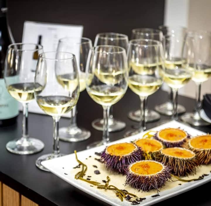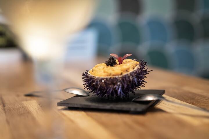 Lass uns die lokalen Produkte der Insel feiern. Lokales Fisch-Carpaccio, Seeigelcreme und gebratener Tintenfisch vom Markt. Hauptgericht, Hummer-Paella. Wir beenden dieses elegante Abendessen mit hausgemachten Feigenkeksen.