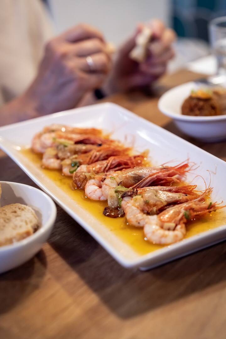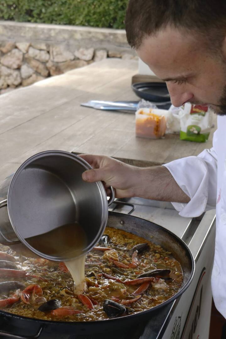 Wir beginnen das Abendessen mit gegrillten Garnelen aus Sóller, gegrillten Jakobsmuscheln mit Miso-Sauce und hausgemachten Kroketten. Hauptgericht mit einer köstlichen Paella mit Meeresfrüchten, gefolgt von Zitronenmousse.