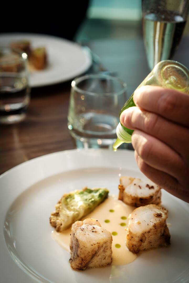 - Seeteufel, Yuzu Beurre Blanc, gefülltes Sommerkohlblatt