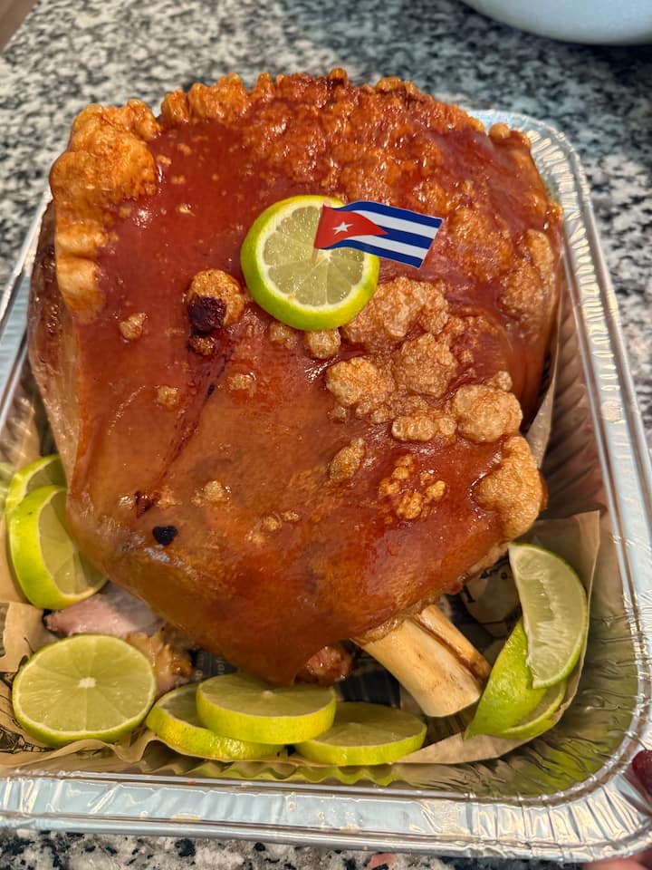 Hauptgericht: Pernil (langsam geröstete Schweineschulter), mariniert mit kubanischen Gewürzen und 8 Stunden lang zart geröstet, mit knuspriger Haut