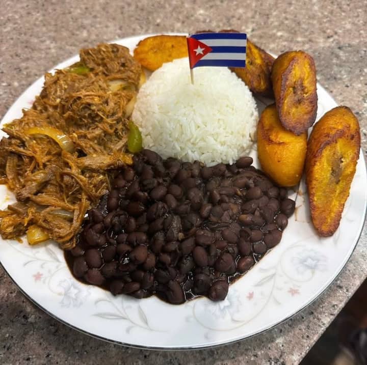 Genieße Kubas berühmtestes Gericht: Ropa Vieja, langsam gegartes Rindfleisch in einer reichhaltigen Tomatensauce. Beinhaltet Congrí oder gelben Reis, süße gebratene Kochbananen, Yuca mit Mojo, Salat und ein kubanisches Dessert (Flan, Tres Leches oder Arroz con Leche). Perfekt für ein Familienessen.