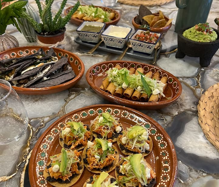 Feiere dein Event mit einem herrlichen Abendessen mit zwei Vorspeisen, einem Hauptgericht und einem Dessert. Für 4 Personen oder mehr. Die Speisekarte besteht zu 100 % aus mexikanischen Gerichten. Es beinhaltet Zutaten, Tischgedeck mit Geschirr aus deinem Haus und Küchenreinigung. Die Gerichte werden in deinem Haus zubereitet, sodass sie frisch zubereitet werden und du lernen kannst, während sie zubereitet werden.