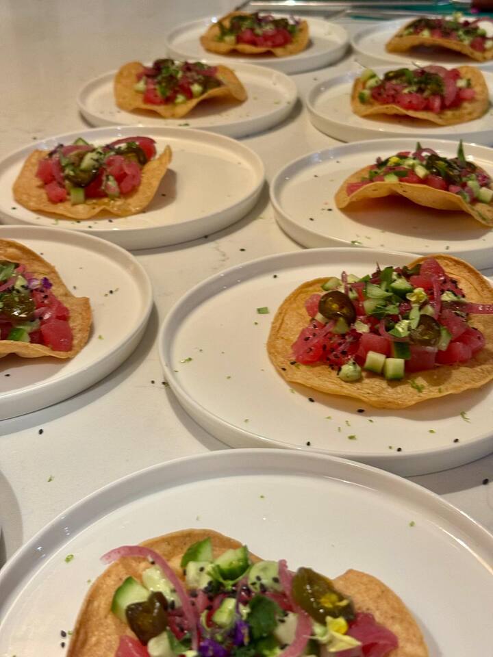 Ein geschmackvolles Abenteuer: würzige Thunfisch-Tostada als Vorspeise, geräucherte Rinderbrust als Hauptgericht, reichhaltige Beilagen und ein Chili-Schokoladen-Dessert.