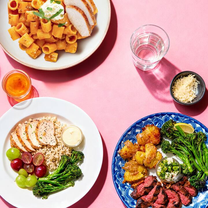 Frisch an deine Tür geliefert zwischen 10:00 und 20:00 Uhr. Eine Geschmacksreise von Napa zum Mittelmeer: Ernte-Huhn | Mit Ziegenkäse gefülltes Brathähnchen auf braunem Reis-Pilaw mit Trauben und Pinienkern-Balsamico-Salsa Baskisch gewürztes gegrilltes Steak | Gegrilltes Skirt-Steak mit Feta-Spargel-Salsa-Verde, Parmesan-Kartoffelpüree und Broccolini. Pink Sauce Rigatoni | Rigatoni in einer seidigen Tomatencremesauce mit gebratenem Hähnchen, Zitronen-Ricotta, Parmesan und Basilikum.