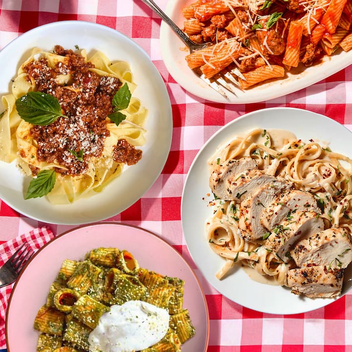 Eine von einem Koch geleitete Tour durch italienisch-amerikanische Gemütlichkeit – mit John DeLucies Sonntagssoße mit Rigatoni (mit würziger Schweinswurst), Kristy Flores Pappardelle mit Rindfleischragù (mit Parmesan und Basilikum), Meena Sreenivas' getrüffelten Fettuccine Alfredo (mit weißem Trüffelöl) und Marc Forgiones gebackenen Rigatoni Pomodoro (mit geschlagener Ricotta). Enthält eine von jeder Mahlzeit.