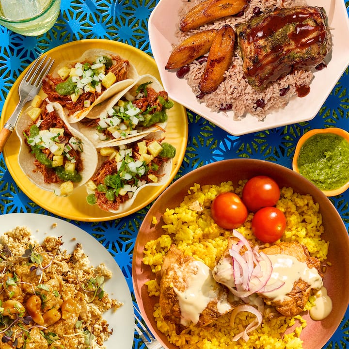 Die globalen Wurzeln von NYC glänzen in dieser geschmackvollen Aufstellung – mit Aarthi Sampaths Jamdown Jerk Chicken (mit Kidneybohnenreis und gerösteten Kochbananen), Akhtar Nawabs Al Pastor Tacos (mit verkohlter Salsa Verde), Andres Mendez Chicken Tikka Masala (mit Basmatireis) und Chase Evans Chicken Shawarma Rice Bowl (mit Tahini und scharfer Sauce). Enthält eine von jeder Mahlzeit.