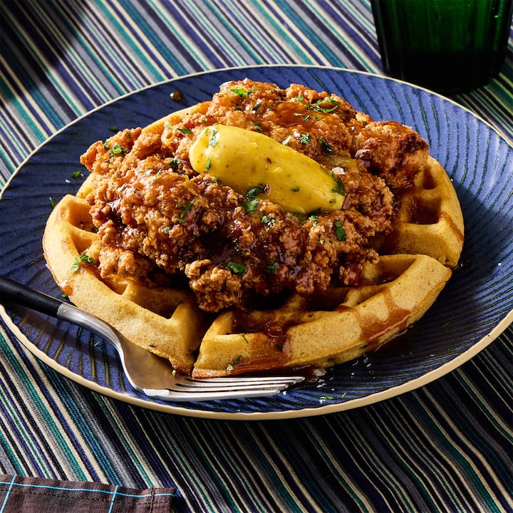 Genieße das legendäre gebratene Hühnchen von Chefkoch Marcus Samuellson, doppelt paniert für extra Knusprigkeit, gewürzt mit BBQ-Gewürzen und auf einer warmen Buttermilch-Maismehlwaffel gestapelt. Ein Klecks Masala-gewürzte Butter schmilzt über die Oberseite. Und nebenbei? Ein süß-salziger Miso-Hot-Honey und ein Schuss heißer Sauce für den klassischen Southern-Snap mit einem globalen Twist. Beinhaltet 1 Mahlzeit pro Gast.