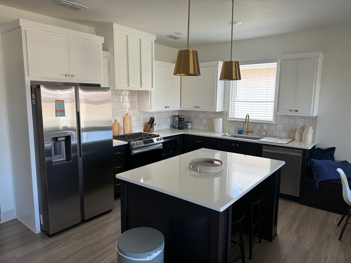 Komm und übernachte in unserem neu gebauten, schönen Lubbock-Haus. Bequeme Anbindung an Texas Tech, fantastische Restaurants und das medizinische Viertel. Alles ist frisch und neu! Genieße die offene Küche mit Edelstahlgeräten. Schlafen Sie bequem in der Master King Suite oder im Queen-Schlafzimmer mit angrenzendem Badezimmer und entspannen Sie sich bei unseren 55-Zoll-Smart-TVs. Genieße es, dich in unserem offenen Wohnbereich zum Kochen, Essen und Entspannen zu versammeln. Dieser komfortable Bereich verfügt über einen 65-Zoll-Smart-TV und bietet Platz für drei weitere Personen.