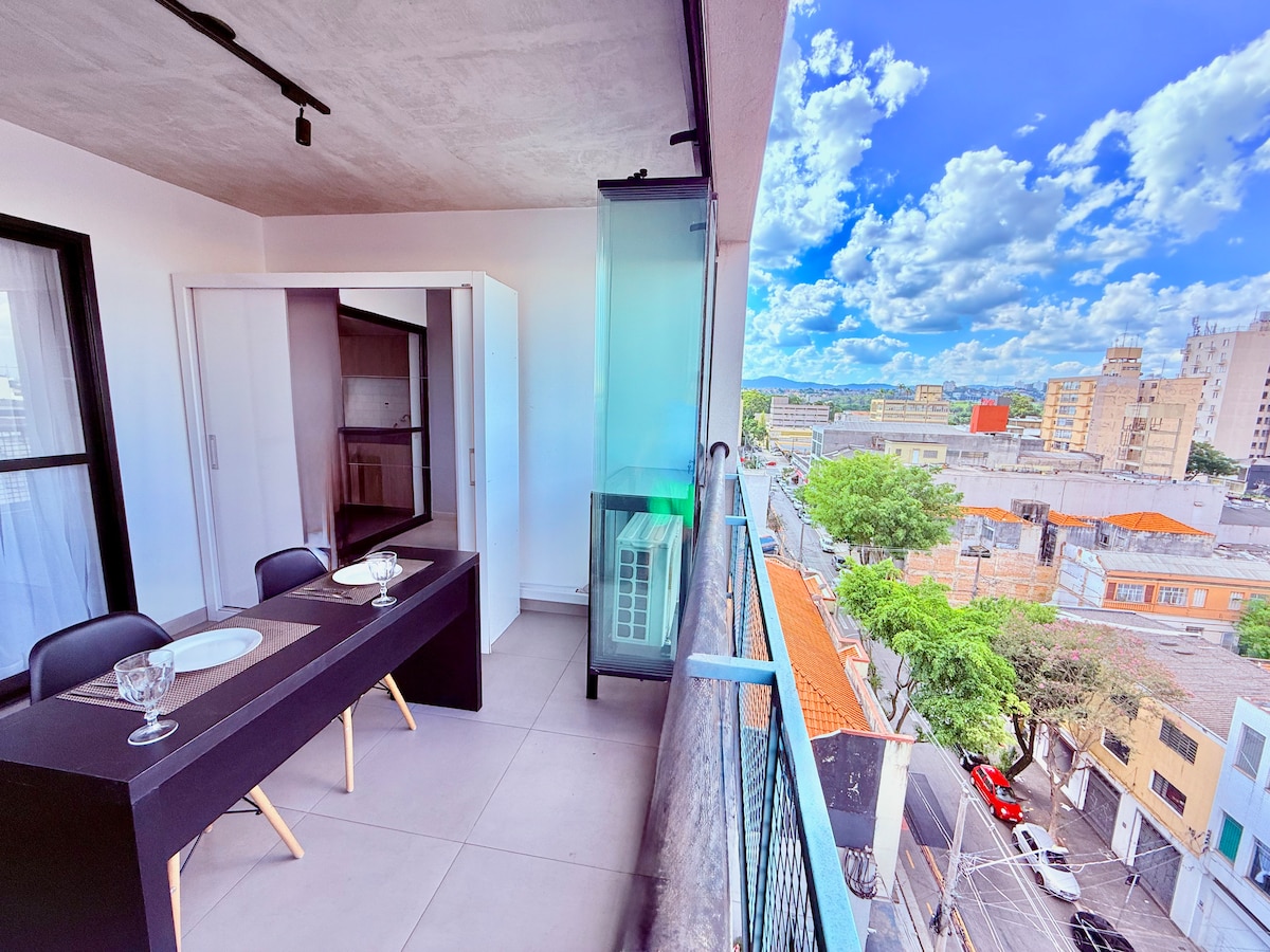 Penthouse with balcony, loft type. Ideal for enjoying or working. Well ventilated and quiet. Cozy, beautiful, with stunning views from the 19th floor. Well-appointed: living room (air conditioning, WI-FI, smart TV 49 , large table), balcony (portable barbecue, coffee table), full kitchen and laundry. Charming, leafy and lively neighborhood, with a wide variety of shops, services and leisure. Santa Cecília Metro two blocks away. Concierge and garage with valet 24 hrs.