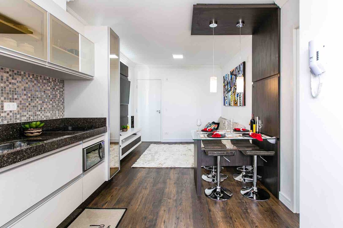 Modernes Studio im Civic Center – ideal für diejenigen, die Komfort, Zweckmäßigkeit und eine hervorragende Lage in Ctba suchen. Klimatisierte Umgebung, ausgestattete Küche und Smart-TV — perfekt für Freizeit oder Arbeit. 🛏️ Sie bietet bequem Platz für bis zu vier Personen und verfügt über hochwertige Bettwäsche. • Beheizter Pool • Fitnessraum • Sauna • Terrasse • Wäsche (kostenpflichtig) 🚗 Parkplatz im Gebäude verfügbar, 35 R$ pro Nacht Zahlung per PIX an den Gastgeber.