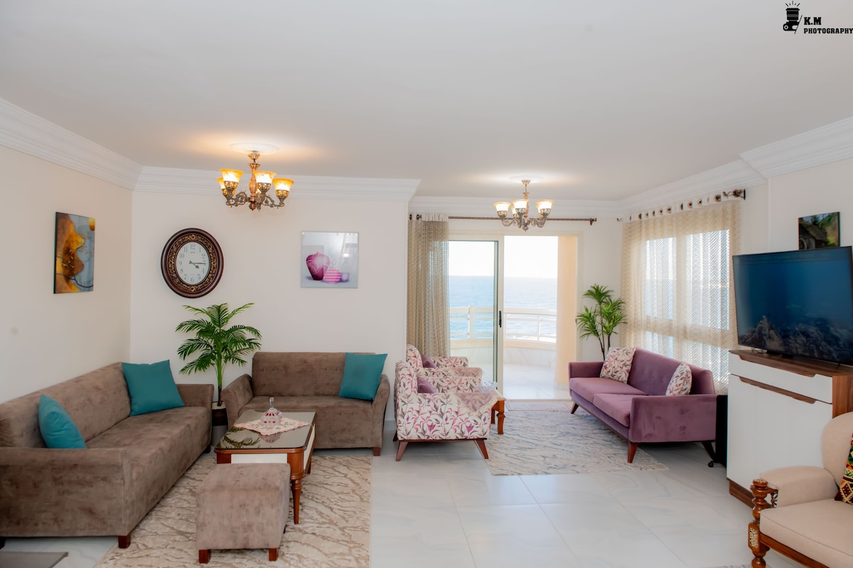 Eine schöne Strandwohnung im Herzen von Alexandria mit atemberaubendem Meerblick von jedem Zimmer aus. Das Apartment befindet sich im 11. Stock und bietet eine voll ausgestattete Klimaanlage, eine große Lounge, 3 Schlafzimmer und eine voll ausgestattete Küche. Genieße WLAN, Sat-TV und frische Bettwäsche, Handtücher. Es bietet Platz für bis zu 6 Gäste und ist perfekt zum Entspannen. Die pulsierende Lage in Strandnähe und Hauptstraße kann gelegentlich Geräusche des Stadtlebens während der Hauptverkehrszeiten haben, was zur lebhaften Atmosphäre beiträgt.