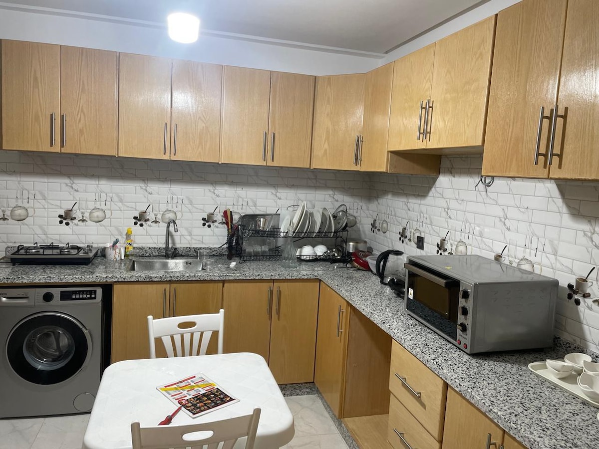 Bel Appartement lumineuse spacieux, neuf 100 m avec ascenseur en 3ème étage . Appartement au centre ville. 5 mns de la plage et Sidi bouzid. 2 mns à pied de Marjane Market.Super Cafe et Restaurant juste en face a pieds. Proches de tous les nécessaires. quartier très calme et très propre. les habitants sont tres respectables et au niveau. l'appartement dispose d'un parking sous sol privé avec des caméras de surveillance 7/7. un gardien est à votre disposition 24/24.