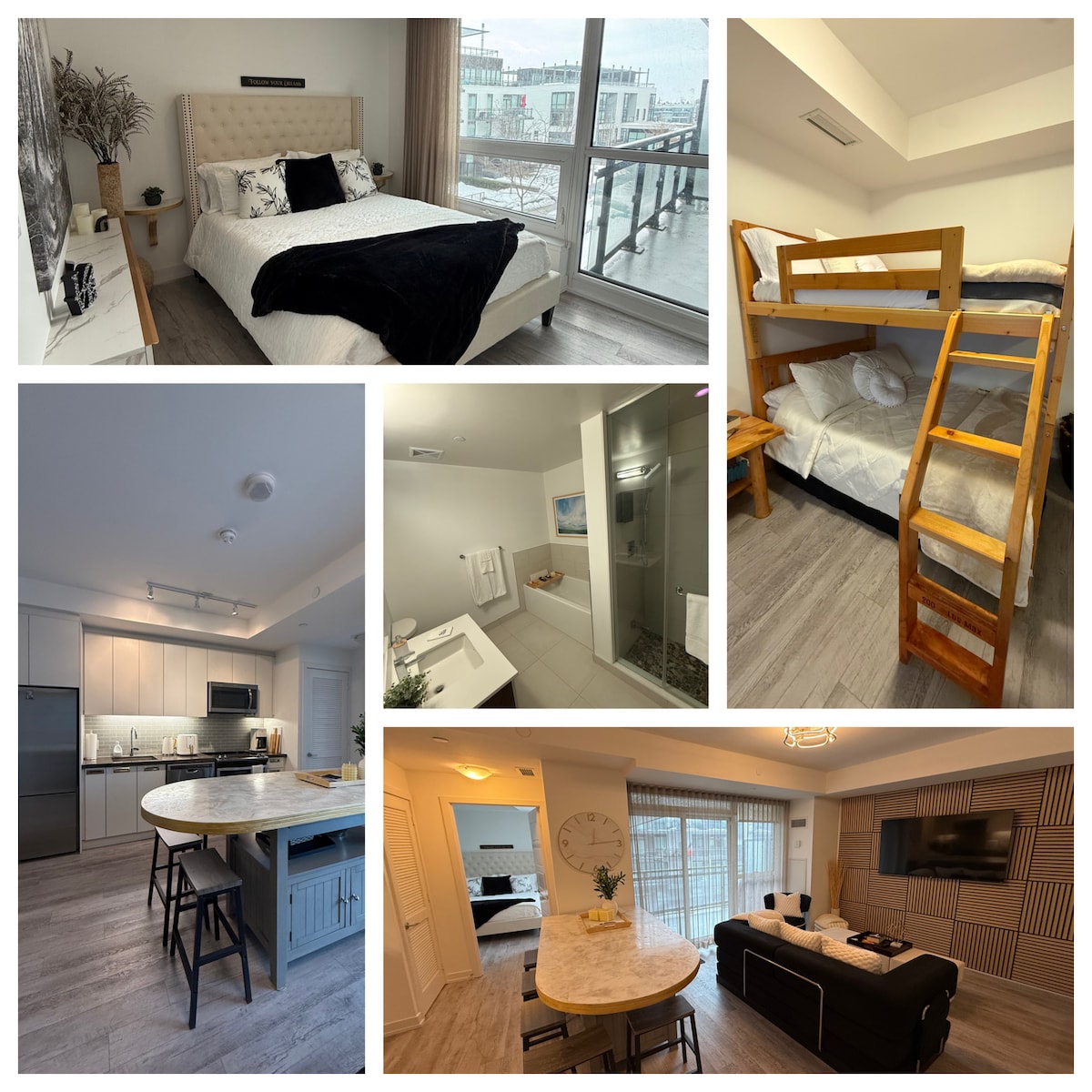 Willkommen bei FriYAY Getaways im Friday Harbour Resort! Schaffe unvergessliche Erinnerungen in unserer einzigartigen familienfreundlichen Wohnung. Wunderschön gestaltet, zwei gemütliche Etagenbetten, zusammen mit einem Queensize-Bett und einem Ausziehbett. Platz für 5-6 Erwachsene und 2-3 Kinder. Jedes Zimmer ist mit einem Smart-TV ausgestattet, der Zugang zu Disney, Amazon Prime und Netflix bietet. Unsere Hinterhof-Terrasse ist perfekt für Unterhaltung, mit einem Grill mit Pizzaofen und Grillplatte