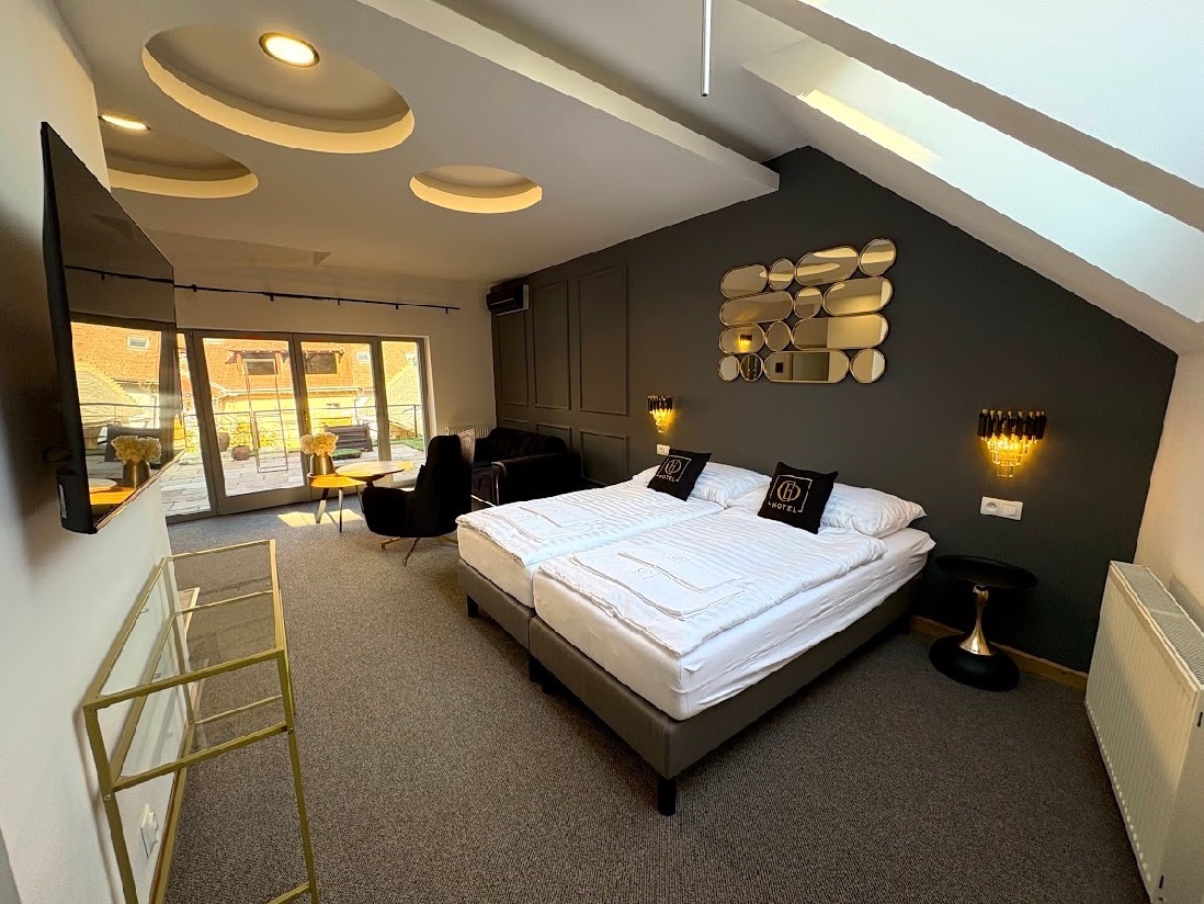 Studio-Zimmer im Hotel Damian 5* (40 m²) mit einem Kingsize-Bett und einem Sofa, das in ein Zusatzbett umfunktioniert werden kann, das bequem Platz für bis zu 4 Gäste bietet. Eine ideale Wahl für Reisende, die eine praktische und komfortable Unterkunft direkt im Herzen des Ski Jasná Chopok Mountain Resort suchen. Bitte beachte, dass der Preis nur für das Zimmer gilt. Der Zugang zum Pürovel Spa und Fitnessraum ist gegen Aufpreis verfügbar.