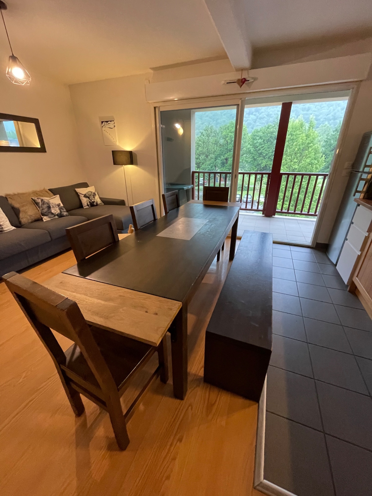 Warm wie ein kleines Chalet, ruhig gelegen, willkommen im Régina! Helles Wohnzimmer, zum Wohnzimmer offene Küche mit Zugang zum 8 m² großen Balkon, der mit Gartenmöbeln ausgestattet ist. Süd nach Südosten ausgerichtet, bietet es eine schöne Aussicht auf die Berge und den Talboden (Venasque). Elternschlafzimmer (Bett 160 cm). Ein zweites Schlafzimmer mit 2 Etagenbetten und ein drittes ausziehbares Bett mit Stauraum Schlafmöglichkeiten für 4 Personen, maximal 5 Personen. Thermalbad-Shuttle vor der Residenz
