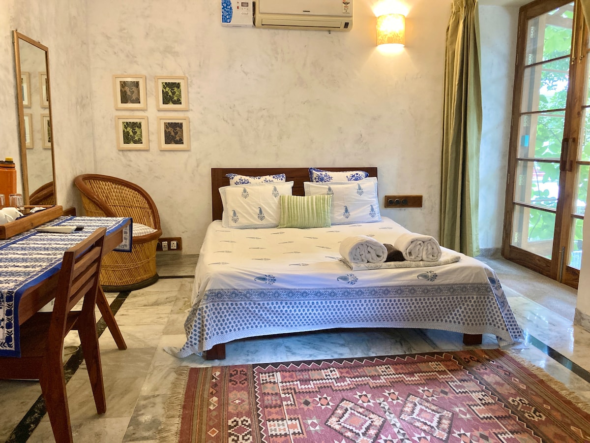 Eingebettet in eine üppige, grüne Umgebung, kürzlich restauriertes Kulturerbe, das verschiedene Kulturerbe-Elemente von Chandigarh bewahrt und gleichzeitig maßgeschneiderte, mit Kalk verputzte Innenräume, eine Kiefernholzküche und ein Wohnzimmer, eine private Bibliothek und einen gemütlichen Kamin hinzufügt. Bio-Gemüsegarten, natürliche Reinigungsmittel, erdiges Design, helles und luftiges Badezimmer und geräumige Vintage-Atmosphäre, Blick auf die Baumkronen für einen gemütlichen, von der Natur inspirierten Kurzurlaub. Zuverlässige Stromversorgung, damit du dich wohlfühlst und mit einem High-Speed-WLAN verbunden bist.