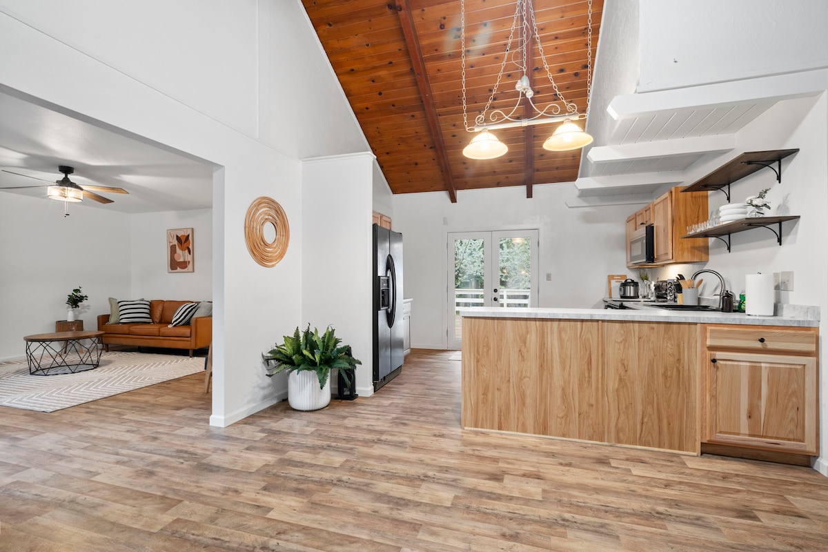 Modernes, wunderschönes, lichtdurchflutetes Haus im Herzen des Goldlandes. Das Haus befindet sich an einem saisonalen Teich und Bach. Setz dich draußen am Brunnen und genieße ein Glas Wein oder Kaffee, während du die Truthähne und Rehe beobachtest, die vorbeikommen. Vielleicht erhaschst du einen Blick auf die Flussotter, die im Teich leben, oder fängst einen Fisch. Kajaks sind verfügbar. Entspanne dich in den Hängematten und beobachte die Sterne. In der Nähe von Yosemite, Wildwasser-Rafting, Goldwaschen, Wandern, Höhlen, historischen Städten, Weingütern, Dodge Ridge & Leland