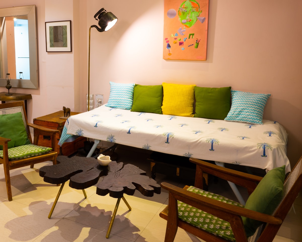 Die Terrassenwohnung befindet sich in einem urbanen Markt – nur einen kurzen Spaziergang vom berühmten Juhu-Strand entfernt. Die Wohnung ist offen und geräumig mit einer langen Terrasse voller Pflanzen. Es ist eine ruhige Oase inmitten einer geschäftigen Stadt. Das Haus bietet bequem Platz für zwei Personen in einem privaten Schlafzimmer und eine zusätzliche Person im Wohnstudio (wenn die Hängematte zählt). Du wirst mit Blick auf grüne Bäume und offenen Himmel aufwachen. Das Haus, obwohl in einem alten Gebäude, verfügt über alle modernen Annehmlichkeiten, die man benötigt.