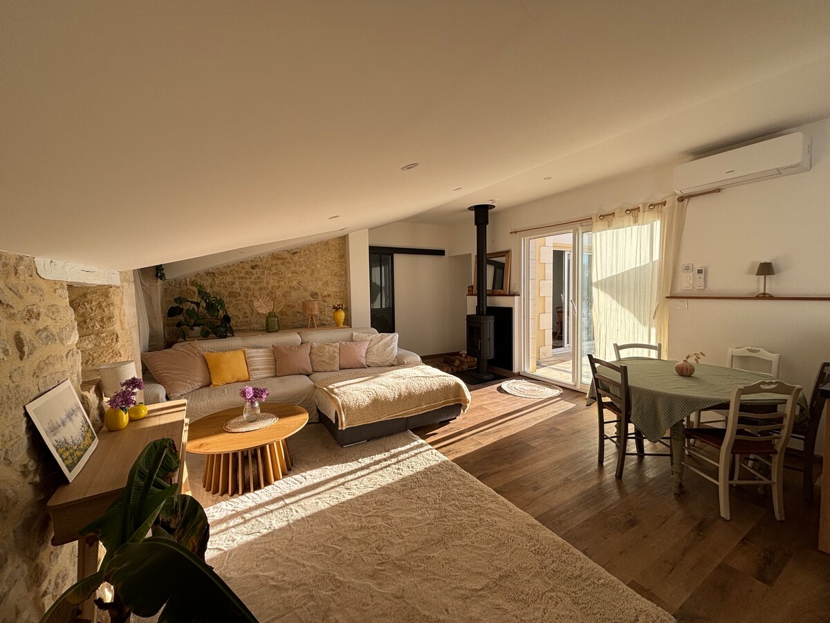 Dieses Haus für 6 Personen liegt auf einem Hügel und bietet Ruhe, Natur und Panoramablick. Privater beheizter Pool (Mai bis September), umzäunter Garten, schattige Terrasse, Außenlounge und Grill. Im Inneren: 2 Schlafzimmer, Schlafsofa, offene Küche, Holzofen und Klimaanlage. Ein herzlicher Kokon, um sich mit der Familie oder mit Freunden zu erholen, im Rhythmus der Sonne und der Stille. Zugang 200 m zum Greenway. Zugang zum TGV-Bahnhof von Angoulême in 30 Min.
