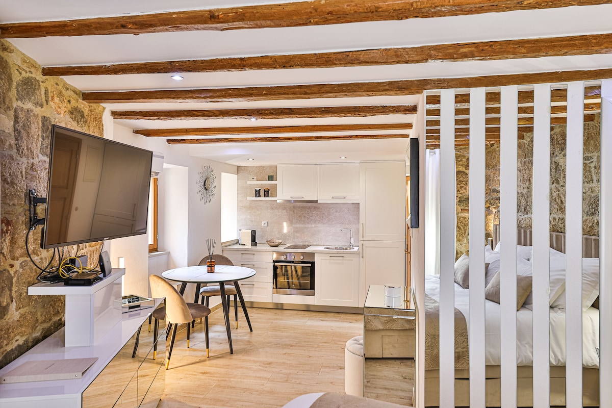 Tritt ein in das Herz von Split und entdecke ein sorgfältig renoviertes Haus, das 300 Jahre Geschichte trägt. Diese außergewöhnliche Wohnung verbindet originelle Details mit modernem Design und schafft eine gemütliche und einladende Atmosphäre, die sich wie Zuhause anfühlt. Erlebe das einzigartige Gefühl, in Steinmauern zu schlafen, während du den Panoramablick auf die alten roten Dächer von Split genießt. Es ist eine faszinierende Mischung aus Tradition und modernem Komfort, die es dir ermöglicht, in das reiche Erbe der Stadt einzutauchen.