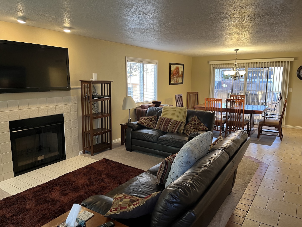 Beautiful condo in St. George! 3 bedrooms and 3 bathrooms. Sleeps up to 10 guests. Balcony overlooks the hot tub and pool, as well as basketball and pickle ball courts. Basketball, pickleball paddles and balls, and boardgames are available at the condo for your use. We love being on the 3rd floor for the view and because we can easily store our bikes on the balcony. There are amazing biking trails all over, with access to the Bearclaw Poppy trail (our personal favorite) right across the street!