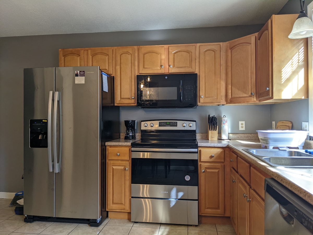Entspanne dich mit der ganzen Familie in dieser friedlichen Unterkunft. Die Einheit ist Teil eines Zweifamilien-Duplexhauses. Du und deine Familie habt die gesamte Einheit für euch allein. Es gibt zwei Schlafzimmer mit Queensize-Betten, ein Wohnzimmer, eine Küche, ein Badezimmer und eine Waschküche. Das Wohnzimmer verfügt über einen Fernseher, einen Kamin und Netflix. Es gibt auch einen eingezäunten Hinterhof mit einer Terrasse und einem Essbereich im Freien sowie einer Feuerstelle. Das Haus ist auch haustierfreundlich.
