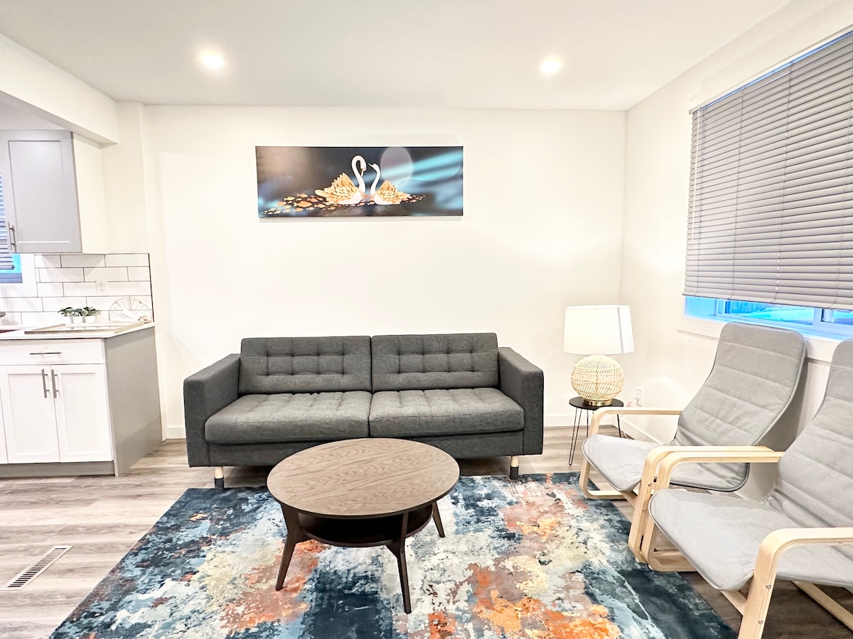 Nestled in a newly built house with its own private entrance, this cozy basement suite offers complete privacy and exceptional comfort — perfect for a relaxing stay. Enjoy a spacious living room, two inviting ensuite bedrooms, a fully equipped kitchen, a study nook, and complimentary laundry for longer stays. Whether you’re here for a family getaway, a work trip, or just to unwind, you’ll find a clean and welcoming space that makes every moment truly enjoyable and wonderfully comfortable.