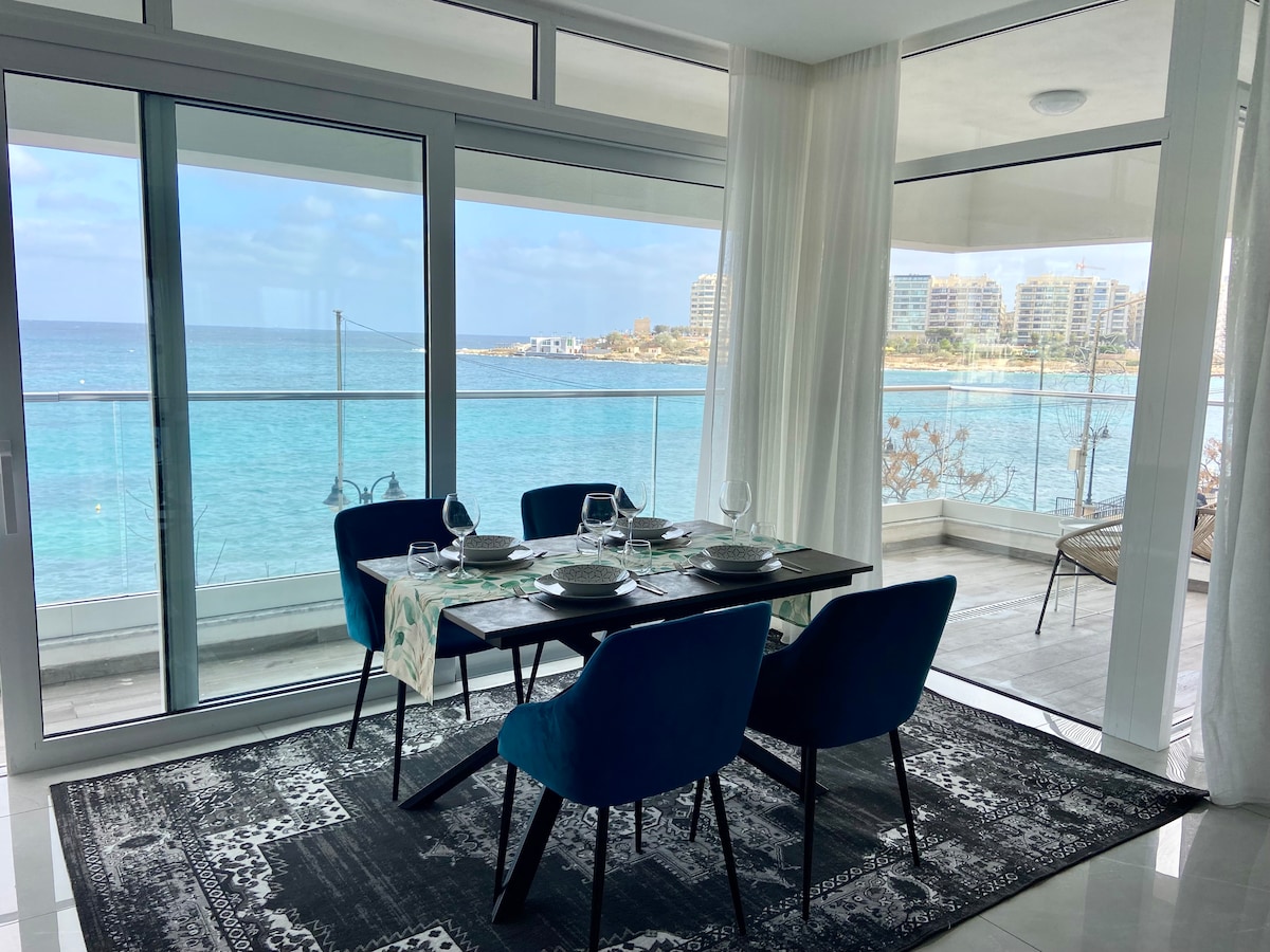 Luxury seafront Apartment with a south-facing balcony overlooking the stunning seaviews of Spinola Bay. Situated very close to the promenade,restaurants,cafes,bars,shops and a short walk to the beach. This 1 bedroom plus 1 bathroom apartment is exclusively designed with marble floors, kitchen/living/dining with top notch appliances, 55’’ TV and Giga Herz internet. 4 corner glass railings of the balcony allows one to enjoy their breakfast/lunch/dinner in the shade during the summer & winter days.