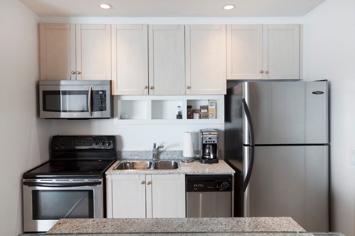 ★ Eine perfekte Einzimmerwohnung hat alles, was du für einen tollen Aufenthalt brauchst: Parkettböden und viel natürliches Licht; Wohnbereich mit entspannendem, übergroßem Sofa und großem Flachbildfernseher; moderne Küche mit Edelstahlgeräten; Kücheninsel, um tolle Mahlzeiten zu genießen; Schlafzimmer mit komfortablem Queensize-Bett; ausziehbares Sofa, das zwei zusätzlichen Gästen Platz bietet; ein komplettes Badezimmer mit Dusche/Badewanne; hohe Decken; Balkon mit toller frischer Luft; Highspeed-Internet; und Waschmaschine/Trockner inklusive; wunderbare Aussicht!
