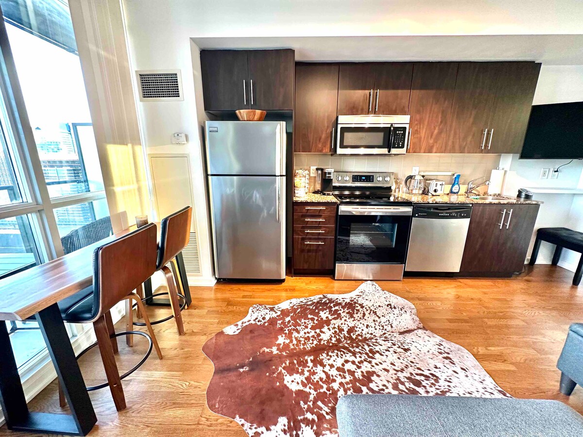 Genieße ein modernes und gemütliches Erlebnis im Herzen der Innenstadt von Toronto. Unsere Eigentumswohnung liegt nur wenige Minuten von allen tollen Attraktionen der Stadt entfernt, darunter Scotiabank Arena, CN Tower, Harbour Front, Ripley Aquarium und viele weitere Orte. Sie ist auch nur wenige Schritte vom Bahnhof Union Station und dem unterirdischen PATH entfernt. Diese Eigentumswohnung eignet sich hervorragend für Reisende auf Geschäftsreisen, Touristen und romantische Aufenthalte im Zentrum von Toronto.