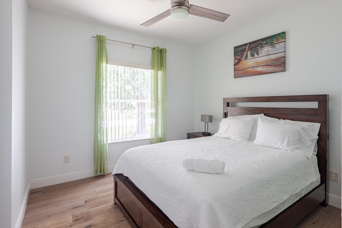 Abgeschiedenes Haus auf 4 Hektar Eichen, Kiefern und Palmen. Genieße eine Tasse Kaffee auf der Veranda, während die Sonne durch die Bäume scheint! Das Hauptschlafzimmer verfügt über ein Kingsize-Bett und eine Doppeldusche. Schlafzimmer 2 verfügt über ein Queensize-Bett und ein ausziehbares Bett. Die Bäder verfügen über Duschgel, Shampoo und Haarspülung. Voll ausgestattete Küche & Gewürze. Gasgrill. 65-Zoll-Roku-Fernseher, Prime, Peacock, 10 Meilen zum Strand. Summer Crush Vineyard 3 Meilen. Lakewood Park: Pool, Discgolf und Ballpark 1 Meile entfernt. Botanischer Garten McKee: 8,5 Meilen. Treasure Coast In. Flughafen 6 Meilen Flughafen Vero 10 Meilen