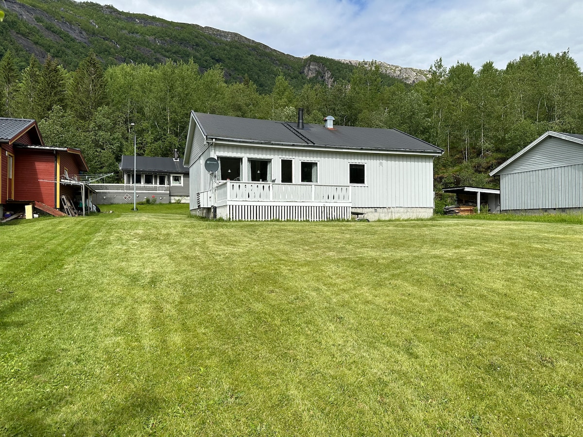 Hier bekommst du alles an einem Ort! Ruhiges Ferienhaus am Süßwasser, Mitternachtssonne, Nordlichter und zentral in Skutvik. Die Hütte befindet sich in einer malerischen Gegend mit Blick auf schöne Berge. Bist du auf einer Reise nach Lofoten? Dies ist ein perfekter Zwischenstopp und du kannst die kostenlose Fähre von Skutvik im Juni/Juli/August nutzen Die Hütte befindet sich inmitten von tollen Wandergebieten mit Jagd- und Angelmöglichkeiten direkt vor der Tür. Hier kannst du auch die Außenbadewanne/den Whirlpool nach Vereinbarung/gegen Aufpreis nutzen und träumen….