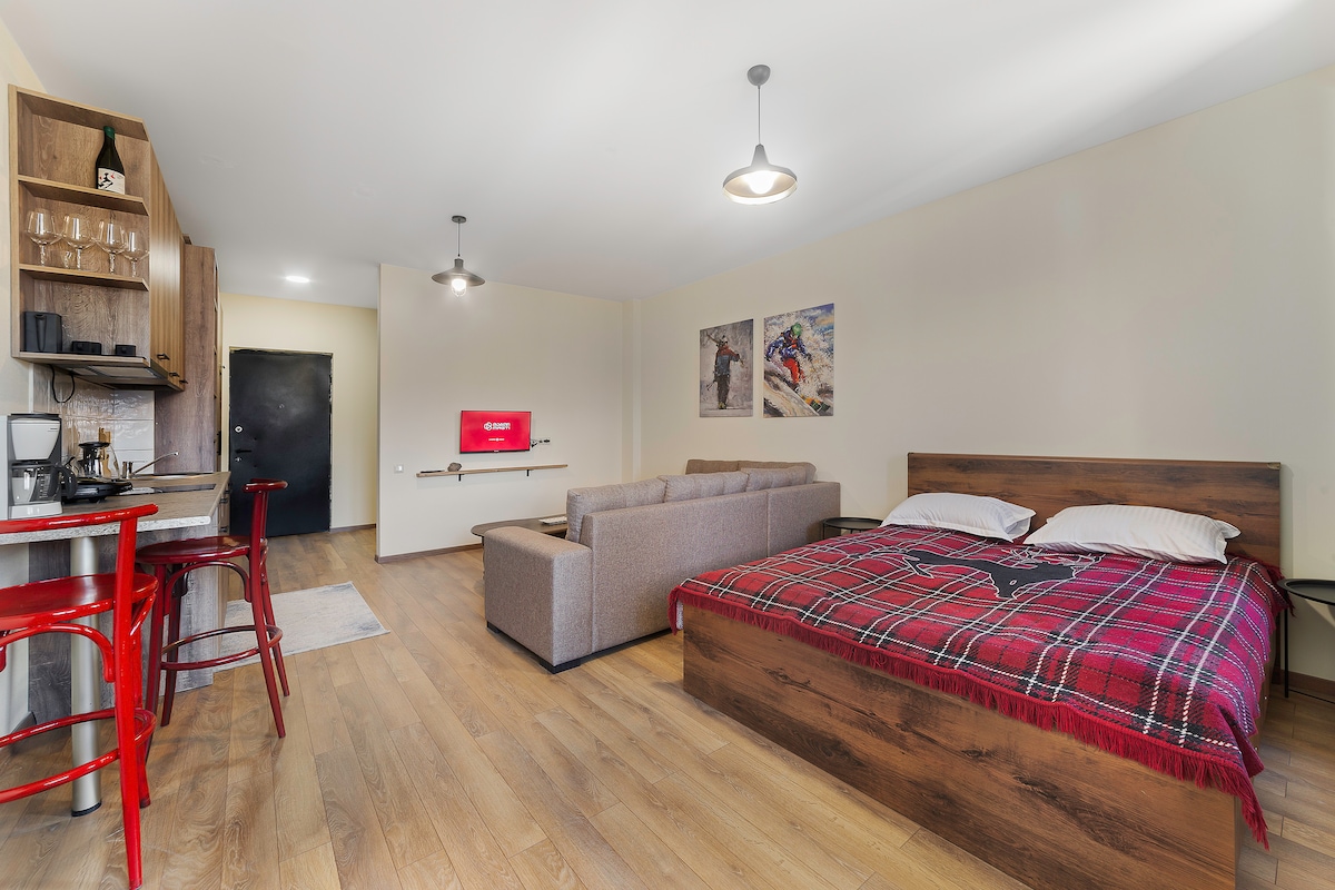 Квартира находится в новом доме.квартира Новая ,полностью мебелизирована и оснащена всем необходимым)расположена на 5 этаже 5этажгого дома .имеется балкон для загара и Ski dep0.дом расположен возле канатки с гондолами:) -2 минуты пешком.верхняя остановка гондолы -это место всех трасс курорта:)