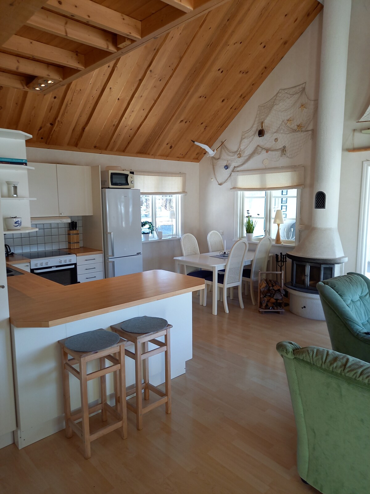 Entspanne dich in diesem einzigartigen und ruhigen Haus direkt am Meer. Das Ferienhaus verfügt über einen Villenstandard mit allen Annehmlichkeiten wie Strom, Heizung, Wasser, Dusche und WC sowie Waschmaschine. Die Küche ist komplett mit Geschirrspüler, Mikrowelle, Umluftofen und Herd mit Induktionsherd usw. ausgestattet. Genieße die Aussicht, den Sonnenuntergang und vielleicht ein paar Nordlichter. Mach einen Waldspaziergang und mach es dir vor dem Feuer gemütlich. Es besteht die Möglichkeit einer Sauna und dann eines erfrischenden Meeresbades. Kanu und 2 SUP-Boards stehen zum Ausleihen zur Verfügung.